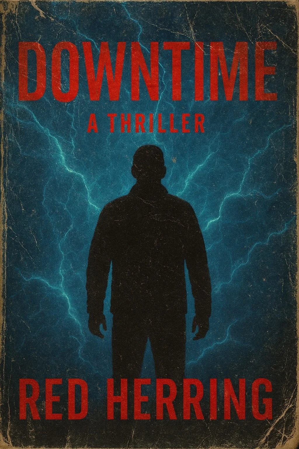 „Bitte generiere einen Thriller-Buchtitel mit der Silhouette einer Person vor einem blauen, elektrischem Geschwurbel. Bitte wende die Drittelregel an, erstelle das Bild im Hochformat. Autor: Red Herring, Titel: Downtime, alle Texte in dringlichem rot.“