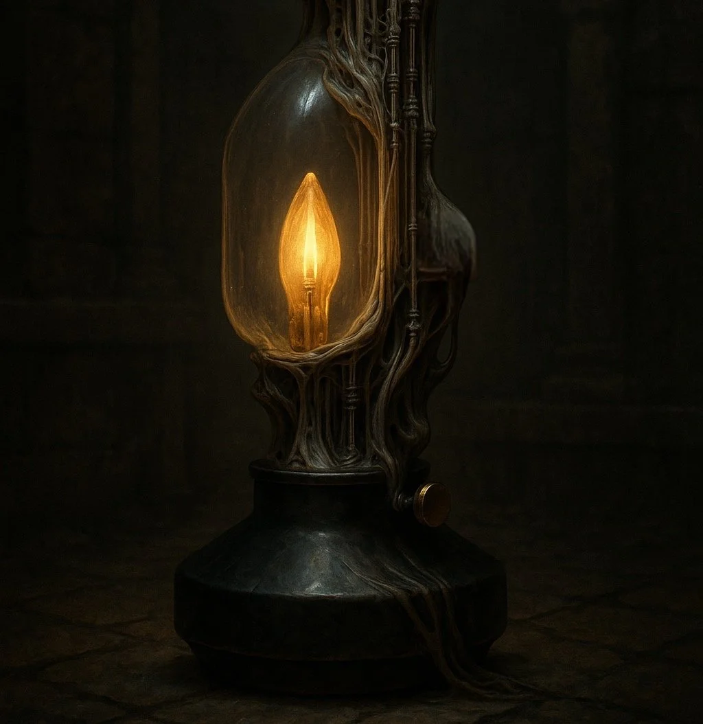 Mit feuchten Fingern drehte er am Regler, zuerst in die falsche Richtung. Dann glomm die Lampe auf, erst schwach, dann zunehmend strahlend. Das Betriebsgeräusch war aufregend und beruhigend zugleich. Marcius war entzückt! Es war, als bringe man das Licht der Sonne in die Schreibstube. Seine strahlenden Augen reflektierten das heilige Licht, denn jeder wusste: Das Officium Sanctae Machinae hatte hier ein Artefakt geschaffen, welches den Satz ›Aus den Gebeinen der Heiligen strahlt das Licht der Ewigkeit‹ wortwörtlich nahm. Diese Lampe enthielt einen winzigen Knochensplitter der Heiligen Lucia von Thyrm, den die Technologie erstrahlen ließ. Angestrengt versuchte er Milchglas und Helligkeit zu durchdringen, um des Splitters ansichtig zu werden, doch stattdessen nahm er ein pulsierendes Muster wahr. Für einen Augenblick schien es den Takt seines eigenen Herzens zu schlagen. Vermutlich war es nur ein Spiel seiner Augen – er zwang sich, zu lächeln.